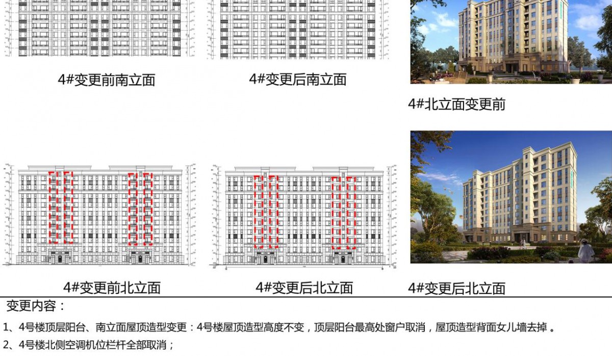 1、1-4号楼顶层阳台、南立面屋顶造型变更:其中1-3号楼顶层中间户阳台层高由7.7米降至3.0米,顶层边户阳台层高由4.8米降至3.0米,南立面屋顶造型高度由3.8米变为2.1米;4号楼屋顶造型高度不变,顶层阳台较高处窗户取消,屋顶造型背面女儿墙去掉。