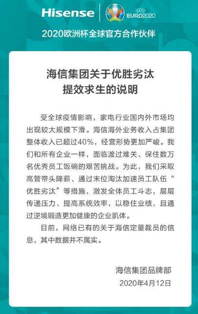 4月12日,海信集团官方新浪微博@海信发布《海信集团关于优胜劣汰提效求生的说明》,内容如下: