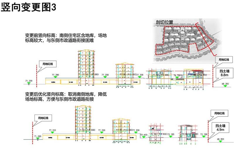 4、竖向变更:将场地东侧与市政道路高差由7m减少至4m,交界处做景观缓坡,中间位置与场地外做退台绿化。