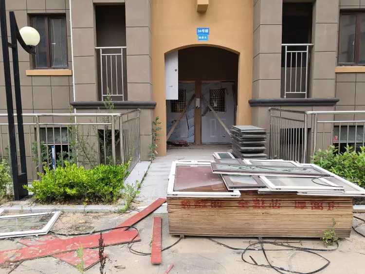 当天上午,来到米罗湾四期项目现场,远远地能听见施工的声音,但走近一看是小区配套幼儿园在装修。11栋露天的商品房区域仍旧一片静悄悄,一年多前拆除了门窗的南立面依然洞开着,路上随处可见堆放的窗户、板材,绿化带里的草木已经很久没打理了。