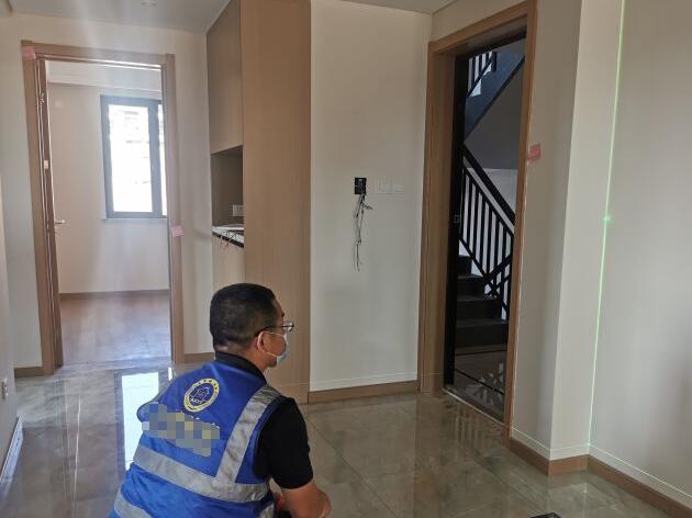 紧接着,验房师又使用激光测距仪、激光标线仪对这处精装房的层高、净深、阴阳角顺直情况分别进行了检查,均符合规范。