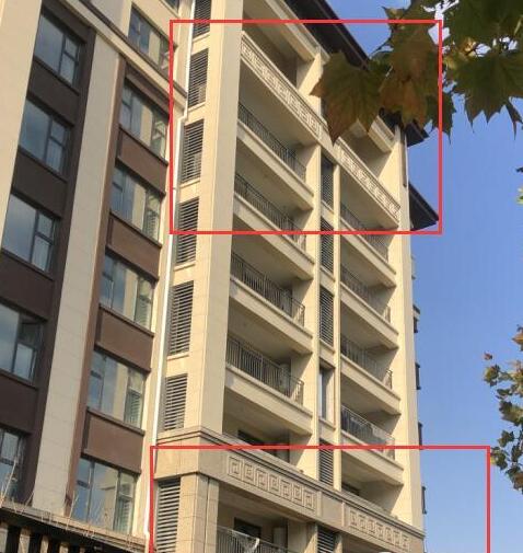 有关海信积米湾的投诉多集中在因为设计影响采光等方面,在小区外看到,每座楼的三层和七层阳台的栏板确实比其他楼层高,已经能遮挡住部分护栏,这对于房屋落地窗的设计来说,确实有可能会影响采光。因为小区内还在施工,不允许外来人员进入,所以信网无法现场看到电梯厅影响客厅采光的情况。