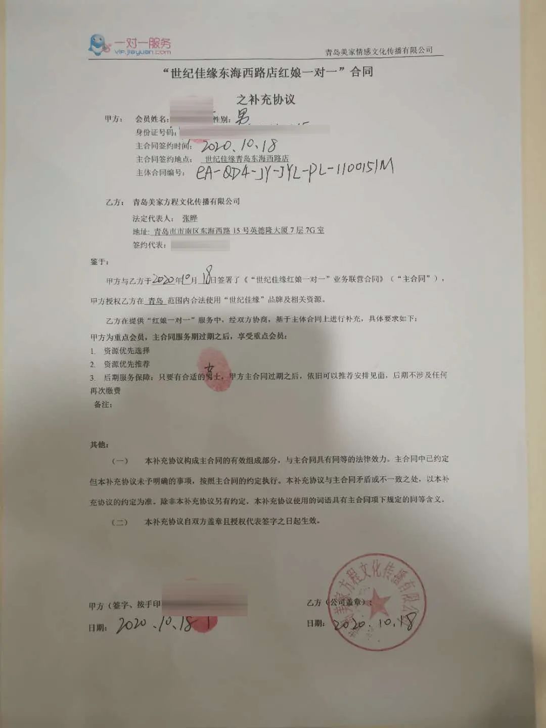 张先生说,他当时抱着试试的态度在世纪佳缘线上注册了一个账号,不久后就有青岛的线下工作人员打来电话让他去聊聊。于是,张先生10月18日下午来到了世纪佳缘青岛东海路VIP服务中心,与一位“红娘”时女士洽谈并签了一份价格为6800元的合同,对方承诺在两个月内帮张先生约见两位满足要求的单身女性。