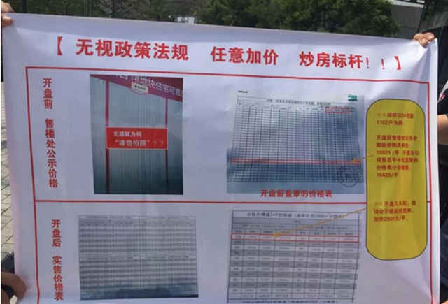 后来,有部分业主拍下了较初公示看板的价目表。经过与认购协议书对比,才发现比公示价格多出了2500元/平方米。发现问题后,业主们组织起来自发维权。“一直在不断地维权,6月24日业主又去售楼处拉横幅维权了,下一步维权力度可能更大一些。”黄先生无奈地讲。