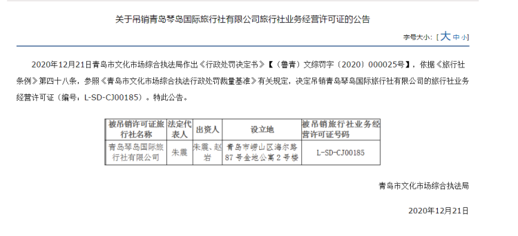 2020年12月21日青岛市文化市场综合执法局作出《行政处罚决定书》【(鲁青)文综罚字〔2020〕000025号】,依据《旅行社条例》第四十八条,参照《青岛市文化市场综合执法行政处罚裁量基准》有关规定,决定吊销青岛琴岛国际旅行社有限公司的旅行社业务经营许可证(编号:L-SD-CJ00185)。特此公告。
