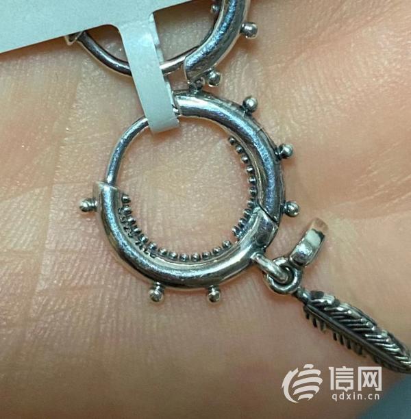 这对潘多拉神圣羽毛耳环是王女士在天猫国际的龙匡海外专营店购买的,这不是她第一次购买这一款耳环,因为之前的丢了,就又重新买了一对。可收到商品后,她明显感觉新耳环跟之前的不一样:“一摸就能试出来表面特别粗糙,而且耳环外面一圈还少了一个珠子。”信网从王女士发来的图片看到,耳环外面一圈原本应该有几颗珠子平均排列,但明显有一处空档较大;而耳环内侧的锯齿也有一处留有较大的缝隙。这些肉眼可见的问题在与官网图对比时,一眼就能看出来。