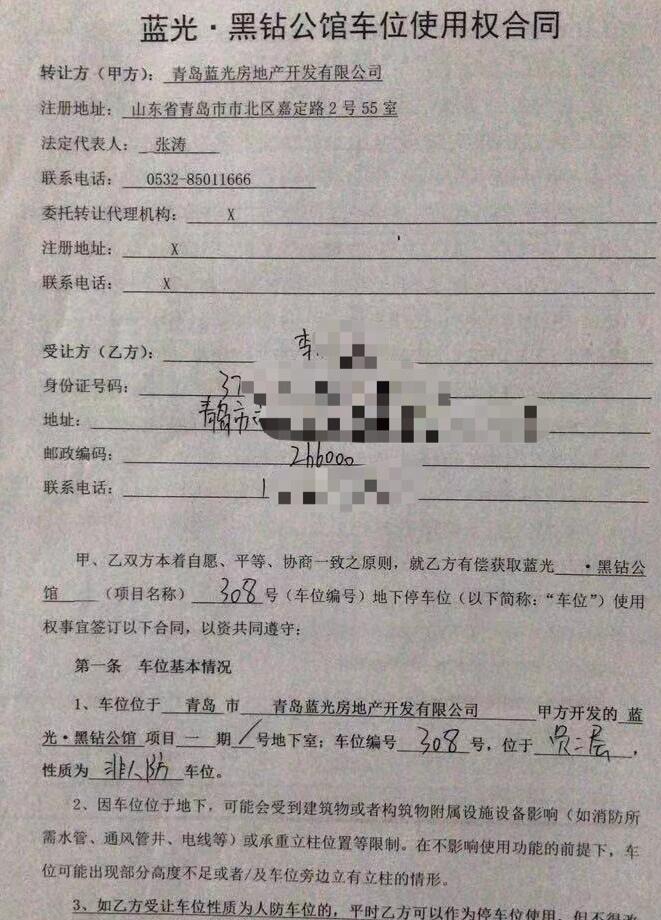 李女士提供了从蓝光地产购买车位所签署的使用权合同及车位照片。记者从合同内容中查看到,李女士购买的为非人防车位,在合同第一条第五项中用特殊字体标注道,“双方确认:由于规范调整、设计变更及人防消防设施影响等原因导致甲方无法按本协议约定位置和编号向乙方提供车位的,由甲方向乙方提供其他区域的车位供乙方停车使用,甲方无需向乙方承担违约责任,乙方对甲方调整的车位无异议。”从李女士提供的车位照片来看,由于人防门的遮挡,确实已经导致车位无法使用。