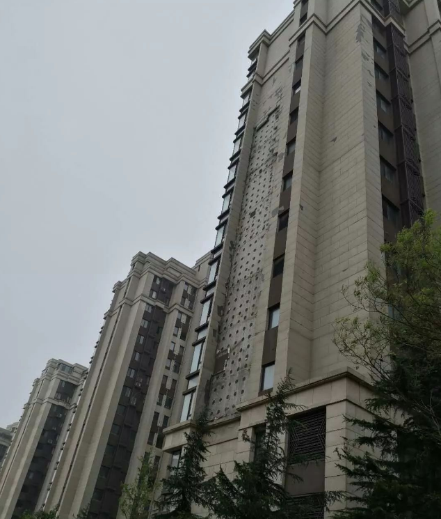 在小区12号楼,记者注意到,有一块区域被用黄白相间的警戒线隔离开来,并竖起了蓝色的铁皮围挡,穿过警戒线和围挡,记者看到在12号楼的西侧有2名工人正在收拾着地上残留的石块,向上望去,整个楼体西侧的墙面都是光秃秃的。“保温层全脱落了,得重新换新的,估计这两天就能好。”其中一名工人告诉记者。据李女士介绍,当天地上堆满了掉落的石块,场面十分惊人,但现在已经都收拾得差不多了。