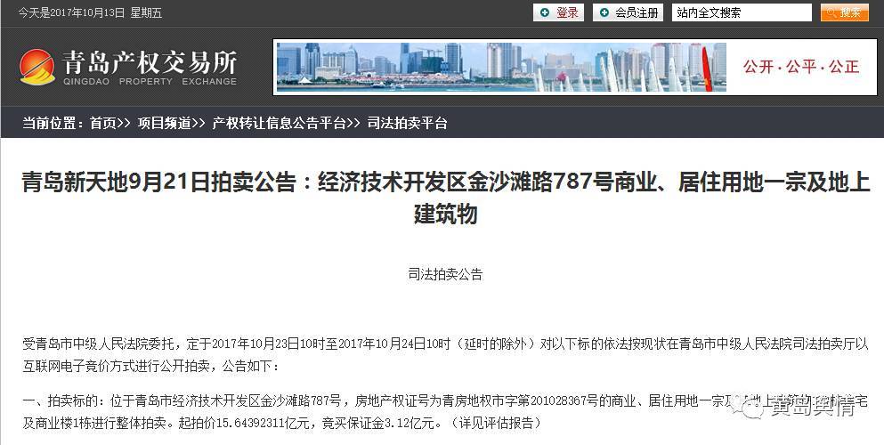 昨日,青岛产权交易所发布一则拍卖公告,将于2017年10月23日10时至2017年10月24日10时(延时的除外)依法按现状对青岛市经济技术开发区金沙滩路787号,房地产权证号为青房地权市字第201028367号的商业、居住用地一宗及其地上建筑物1-7栋住宅及商业楼1栋进行整体拍卖。