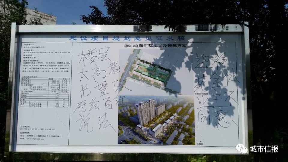 记者在现场探访时,公示牌已经被拆除。根据胡先生提供的当时照片,记者注意到,建设项目名称已经冠以“绿地”,叫做“绿地香海汇都”,地块内主要设计有15层住宅,33层住宅,6层公寓,2层商铺,建筑密度30%,容积率2.20,总户数346户。公示时间从5月27日—6月2日,反馈方式包括一个86997016的座机号码以及一个电子邮箱。此外,公示牌上还印有项目规划图和鸟瞰图,根据图上可知,新项目主要分为前后两排,较高的两栋楼位于后一排,15层的居东,33层的居西,后一栋比黄海大厦,更靠近迎祥苑。有业主为了表示不满,直接在公示牌上写了“反对”“挡光”等几个大字。