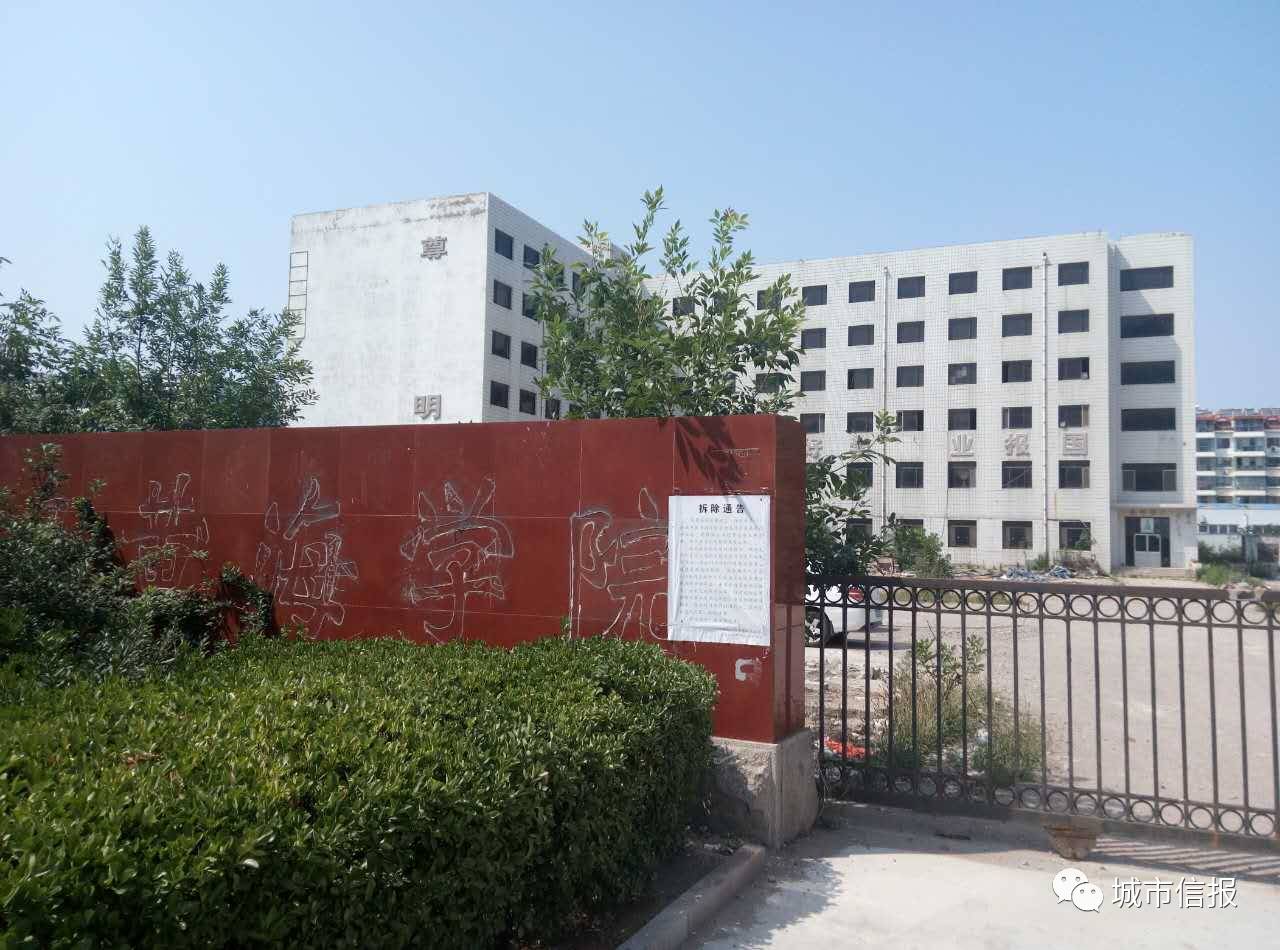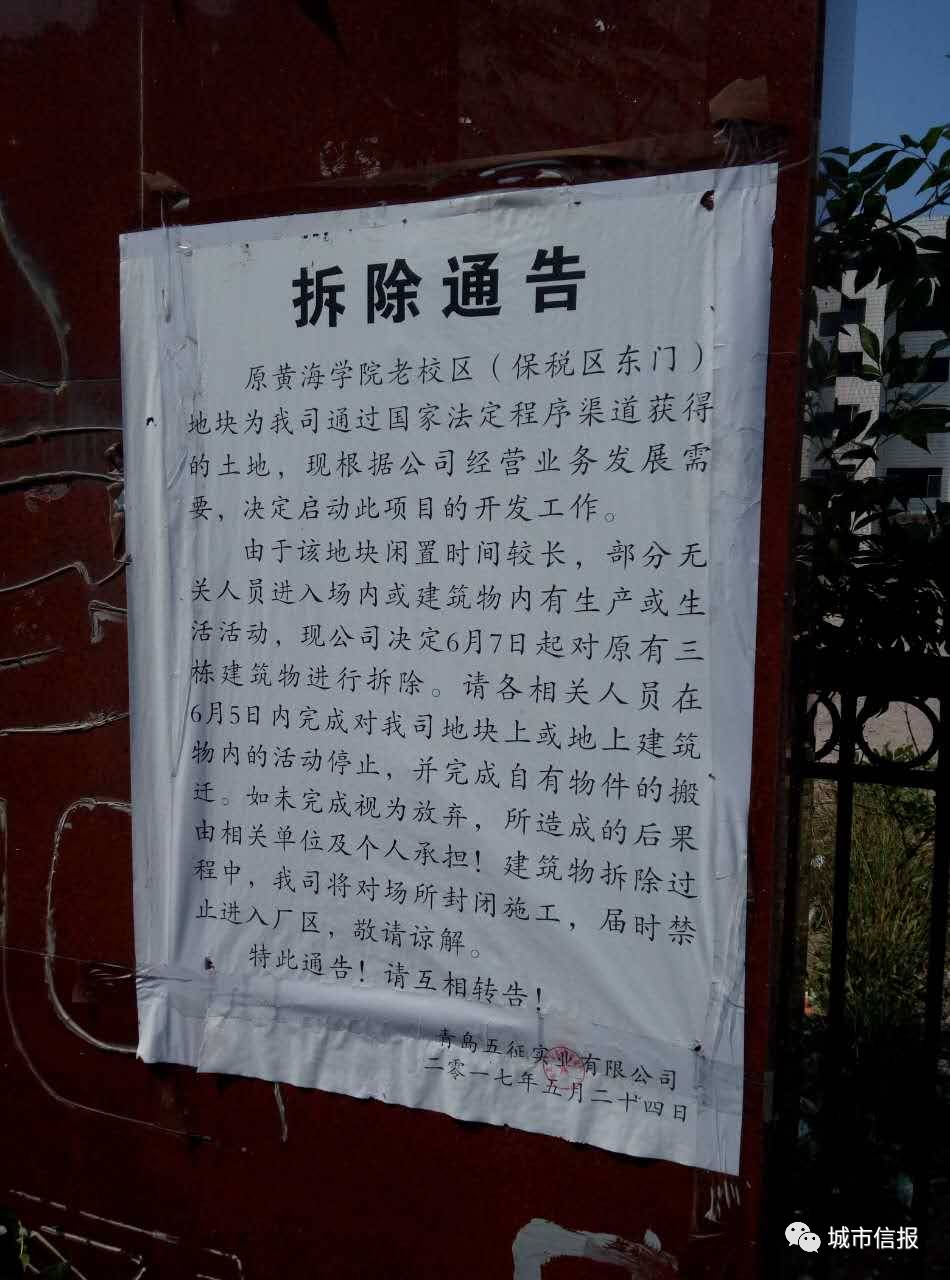 随后,记者来到现场一探究竟,该校区已经弃用,内部早已搬空,剩下两栋教学楼,以及北侧围墙处的一排平房,靠近校门口的空地停了几辆私家车,荒地俨然成了附近居民的停车场。记者注意到,校门外侧贴了多张白纸黑字的大幅“拆除通告”,内容是“地块闲置时间较长,部分无关人员进场内有生产生活活动,公司决定6月7日开始对地块上建筑进行拆除,要求相关人员在6月5日将自有物件搬迁,逾期视为自动放弃”,落款“青岛五征实业有限公司”,时间为5月24日。