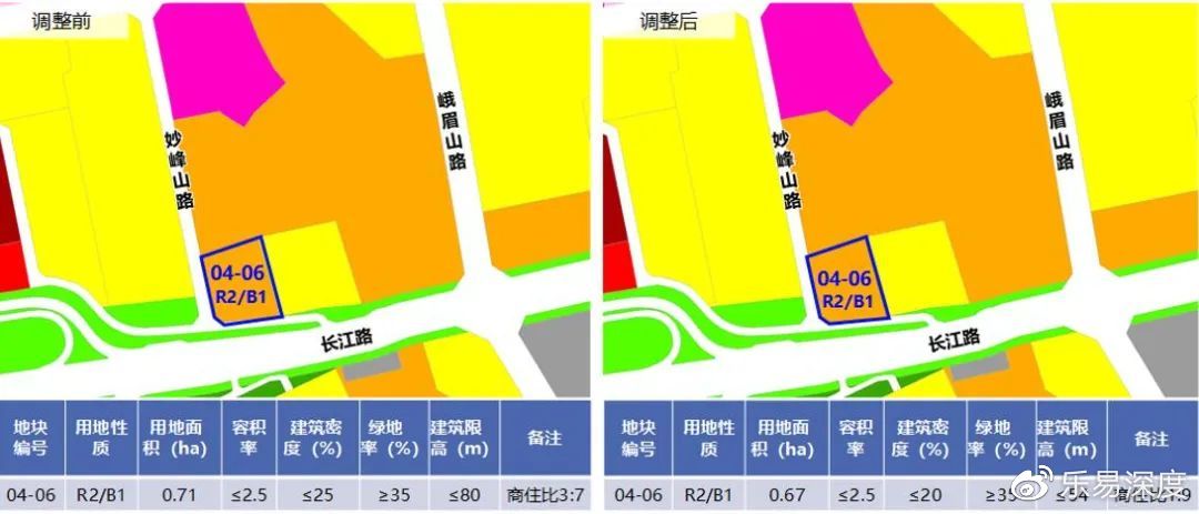唐岛湾中心西片区控规XHA0503单元调整,XHA0503-04-06地块,位于长江路以北、妙峰山路以东,用地面积为0.67公顷,用地性质为商住用地,建筑密度由≤25%调整为≤20%,建筑限高由80米调整为54米,商住比由3:7调整为1:9,其他指标保持不变。