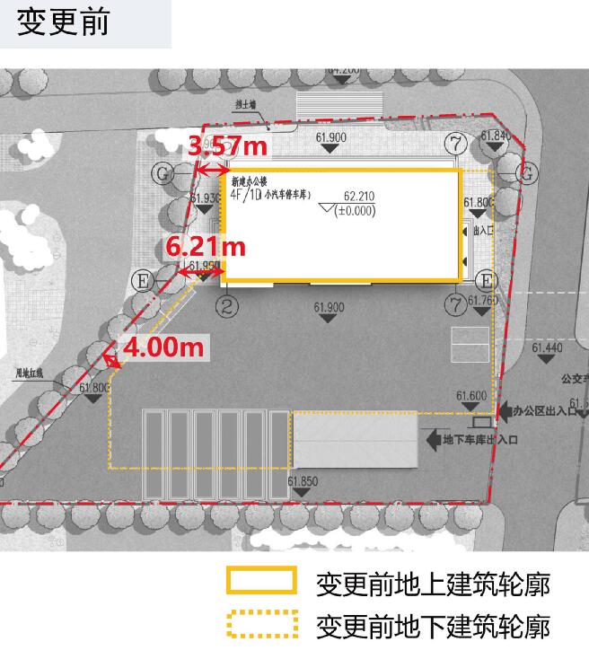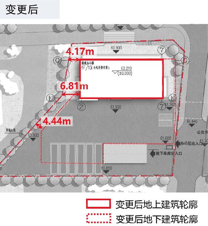 为减少基坑开挖施工过程中对西侧挡土墙基础的影响,将西地块地上及地下建筑整体向东平移0.6m,坡道位置及各项规划技术指标不变。