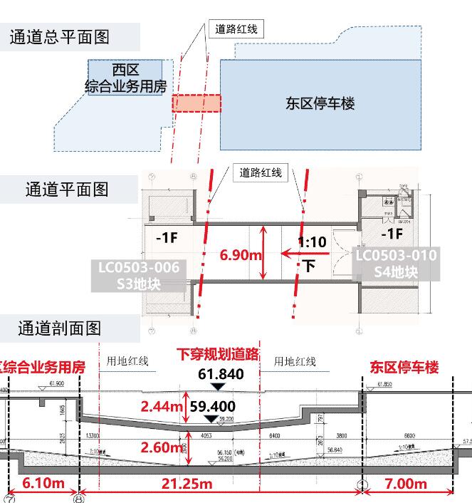 为加强东西区交通联系,设置地下通道连通东西地块,通道长约21米,宽约7米,建筑面积163.65㎡。