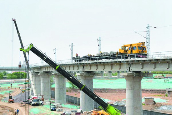 为尽量减少铁路对城市用地的切割,青荣城际与青盐铁路联络线走向为曲线,较小曲线半径为400米,设计时速80公里。针对这一线路特点,施工单位对桥梁梁体进行了加宽,对箱梁钢筋结构进行了局部加密,以满足列车拐弯时对梁体承载力的要求。