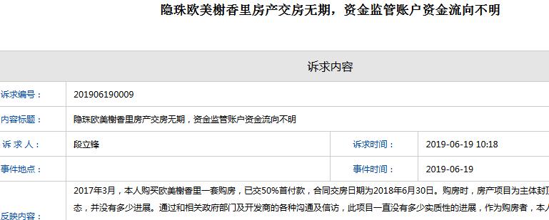 业主段先生称,2017年3月,购买欧美榭香里一套购房,已交50%首付款,合同交房日期为2018年6月30日。购房时,房产项目为主体封顶状态,时至今日,项目还是此状态,并没有进展。通过和相关政府部门及开发商的各种沟通及信访,此项目依然无进展,作为购房者,怀疑此项目涉及的企业及相关部门存在有霸王合同、资金监管部门相关工作人员不作为等行为。为保障本人及小区其他购房者的利益,希望有关部门对本小区业主公开此项目资金监管账户的使用及拨付情况,以保障本小区购房者的合法利益。