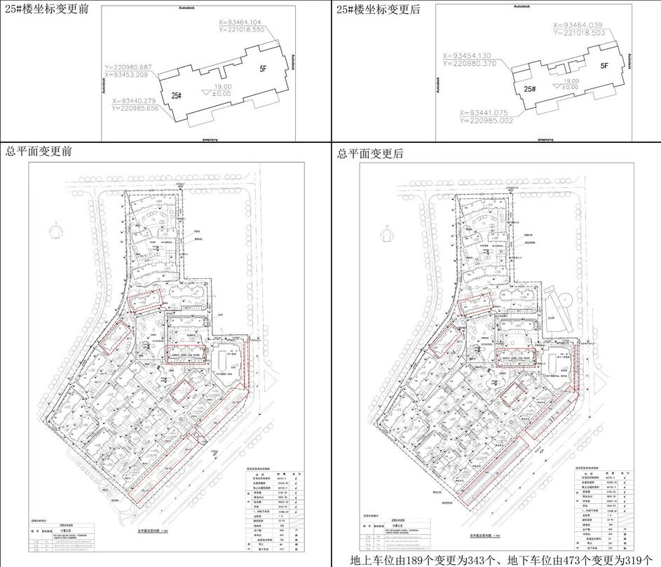 变更内容有:1、取消地下立体停车,地下车位由473个调整为319个,地上车位由189个调整为343个,总车位数662个保持不变。2、25#楼坐标北移1米。3、7#楼正负零由15米调整为15.5米;16#正负零由15.05米调整为15.25米,21#楼由23.7米调整为23.4米。